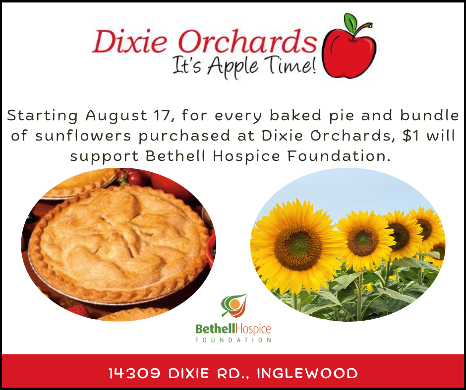 Plan a visit to Dixie Orchards at 14309 Dixie Rd. in Caledon, where fall fun awaits! Stroll through the orchard to pick your own apples, find the perfect pumpkin in the patch, and treat yourself to delicious baked goods and unique specialty items at the charming porch market. From August 17 through October 30, Dixie Orchards will donate $1 from every pie purchased, and $1 from every sunflower bundle to Bethell Hospice Foundation.